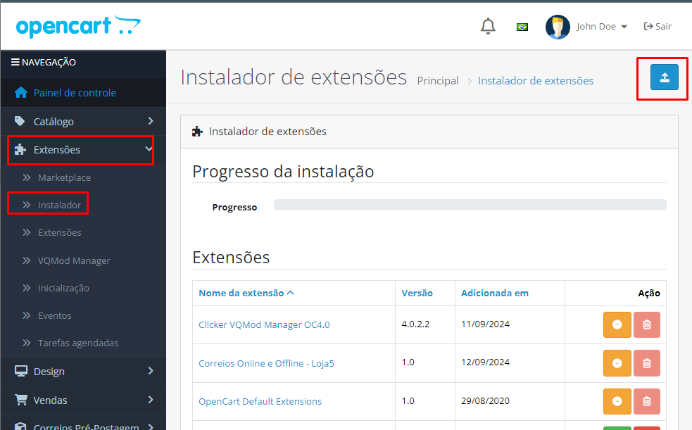 2b - A instalação em Opencart 4.x poderá ser feita por o instalador da propria Opencart, para isso acesse o menu Extensões > Instalador, clique no icone de upload e escolha o arquivo de seu módulo de nome mercadopagopro5.ocmod.zip e aguarde a instalação.
