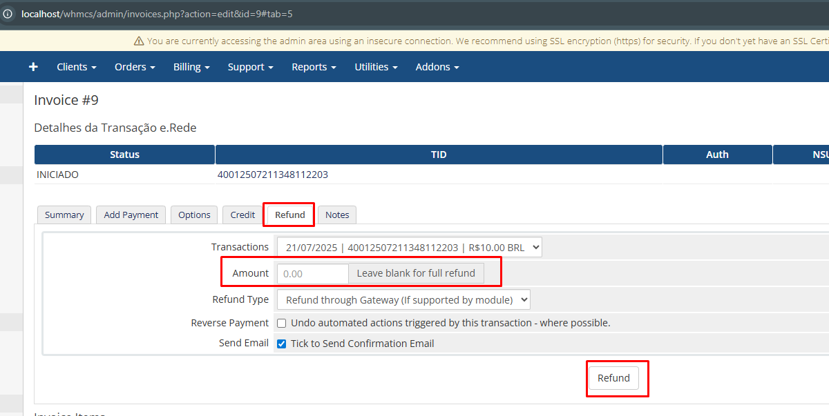 4 - Configure-o de forma correta e por completo, lembre-se que já deverá ter o PV/Afiliação e Token de Integração, para obter os mesmos siga as instruções do guia https://loja5.zendesk.com/hc/pt-br/articles/360019902552-Obter-a-Flia%C3%A7%C3%A3o-e-Chave-Integra%C3%A7%C3%A3o-token-para-e-Rede-API , com estes dados em mão configure todo o módulo e campos exibidos na tela (em cada campo vai ter instruções, configure-os corretamente da forma que deseja usar e por completo) e salve as configurações e não esqueça configurar a URL de notificação em sua conta Rede ( https://developer.userede.com.br/e-rede#documentacao-pix-cadastro-url ) comando de cron em seu servidor (roda de 15 em 15 minutos), este comando é muito importante pois é quem consulta se os pedidos foram pagos ou não e por fim da baixa e atualizar as faturas em seu WHMCS.