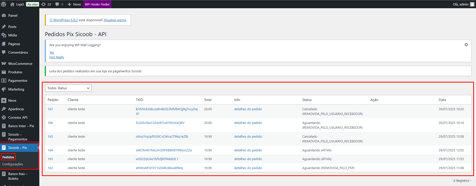 Para consultar todos os pix emitidos em sua loja no menu principal do admin de seu wordpress clique no menu abaixo para ter acesso aos pedidos.