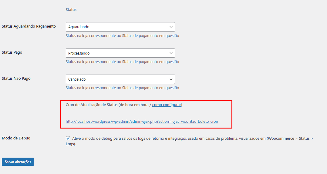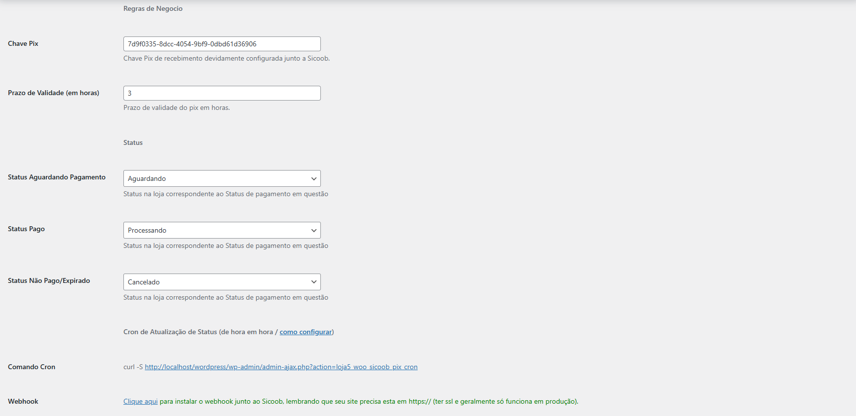 Para atualização automática dos status de pedidos já pagou, expirados ou cancelado em sua hospedagem crie um nova tarefa de cron para a url do cron que é exibida em seu plugin, sem ele configura os status não vão ser atualizados de forma automatizada, cuidado para não configurar um tempo de processamento muito pequeno e sobrecarregar seu servidor, o ideal é a cada uma hora ou se seu servidor tem um bom processamento a cada 10 minutos.