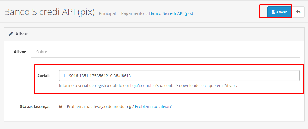 Após instalado, acesse as configurações do mesmo onde inicialmente deverá ativar a licença do módulo em sua loja (igual na tela abaixo). Ao acessar, caso exiba o campo pedindo o serial, apenas informe o mesmo e clique em Salvar (copie o serial em sua conta em nossa loja no menu Downloads). Ao salvar, caso não exiba a tela de configuração clique aqui e clicar em ativar.
