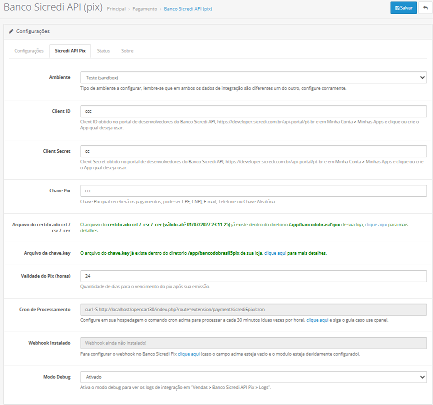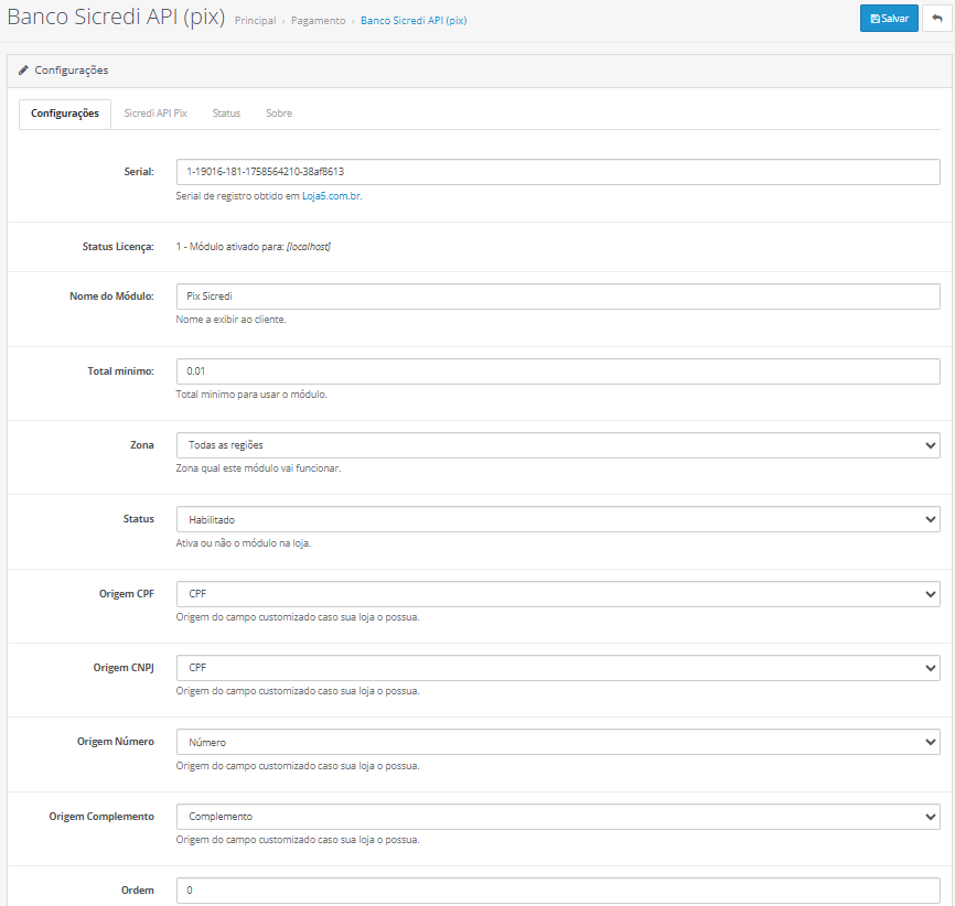 - Caso ative corretamente, agora é só configurar o módulo com suas credenciais Sicredi, configure todos os campos de forma correta e com dados válidos, origem dos campos customizados e status de situações de pedidos; feito isso, salve as configurações.