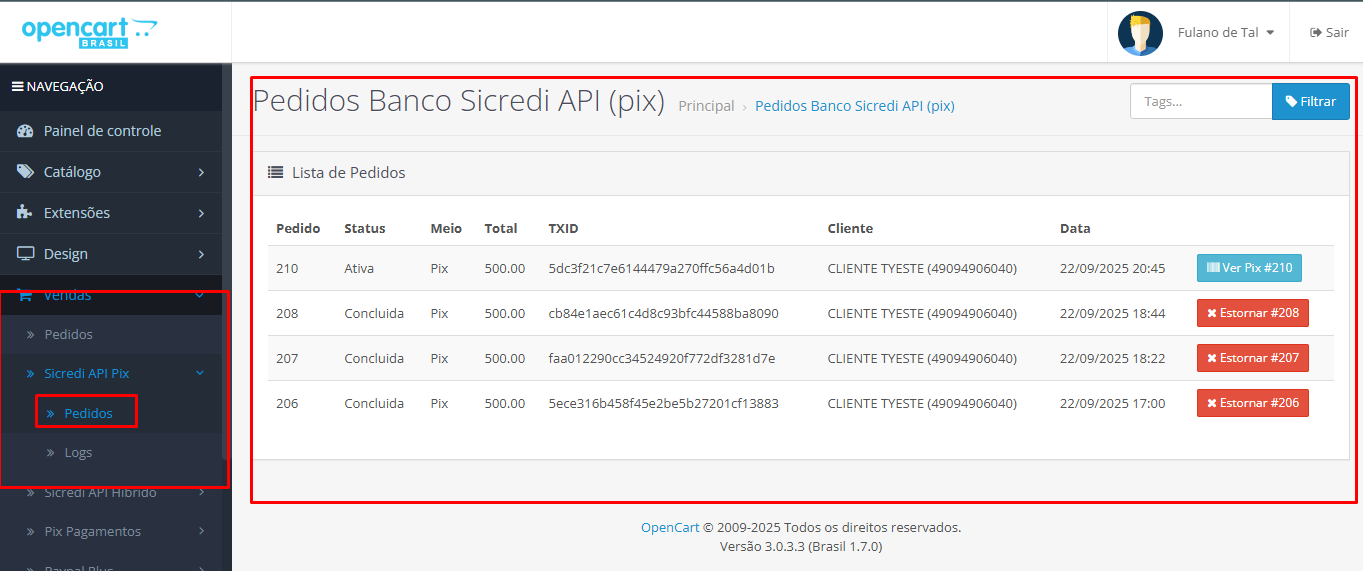 Depois de enviados os arquivos por FTP, acesse o Admin de sua loja Opencart e depois em Extensões > Modificações e clique em “Recarregar”, ainda no Admin acesse Extensões > Pagamento e localize o módulo “Sicredi API (pix)” e o instale.